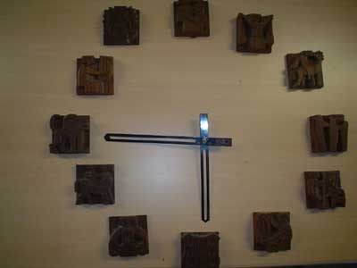 Geschiedenis: Sommige medewerkers van de school herinneren zich nog dat de klok ( de blokjes opgeplakt op een schrootjeswand) in de aula zat; in 1989 is de klok gesloopt en zijn de elementen in een doos opgeslagen. De klok zal opnieuw worden samengesteld en een plaats krijgen in de nieuwe VMBO-locatie, De Meander.