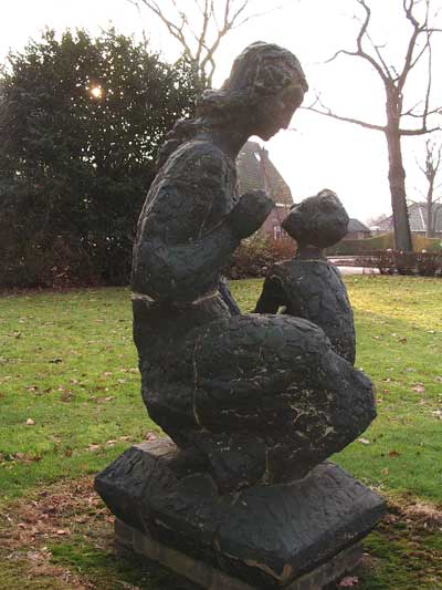 De moeder is 125 cm hoog en het kind 75 cm; ze staan op een gemetselde ondergrond van steen met daarboven een ondersteun van hetzelfde materiaal als het beeld.