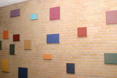 De schilderijtjes tonen teksten die door middel van zeefdruk zijn opgebracht; het linnen is om een raam gespannen en heeft geen omlijsting. De schilderijtjes in de centrale hal hebben zeer gevarieerde kleuren; de teksten zijn op het linnen gedrukt in een variant van hun ondergrondkleur; de schilderijtjes in de twee trappenhuizen zijn om en om een wit schilderij met zwarte tekst en een zwart schilderij met witte tekst.