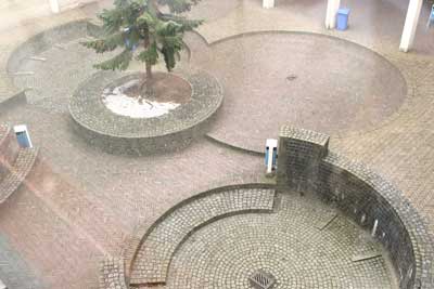 Bijzonderheden: Oorspronkelijk waren in de vormgeving ook houten zitbanken opgenomen en beplanting. In de loop van de jaren zijn de banken eruit gesloopt en is de beplanting tot één boom beperkt; dit alles uit overwegingen van beheersing van het onderhoud. In 1982 heeft de Ingenieurs Architecten Associatie (IAA) in Enschede voorgesteld om deze "bestratingsplastiek" te overkappen waardoor de functie van verpozingsruimte voor de leerlingen aan de binnenplaats teruggegeven zou kunnen worden; het voorstel is niet aangenomen.