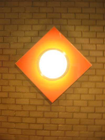 | Bijzonderheden: De ontwerper heeft ervoor gekozen om een lamp toe te passen die ook elders in het gebouw op meerdere plekken hangt. Deze lamp is geplaatst in het verlengde van de lampen die al in de vloer geplaatst waren. Als achtergrond van de lamp is gekozen voor een oranje vierkant met één punt naar links en één punt naar rechts. Op die manier wordt de keuze van een te volgen richting aangegeven en wordt het einde van de gang benadrukt. De rand van het oranje vierkant is afgewerkt met aluminium strips, die voortborduren op het ritme van de zijkant van de lamp. De oranje kleur reflecteert het licht in geel en oranje, accentueert deze donkere hoek en contrasteert met de kleur van de muren. |
